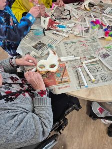 Ă lâoccasion du carnaval de lâEHPAD, une activitĂ© manuelle haute en couleurs a rĂ©uni rĂ©sidents et enfants autour dâun projet commun : la crĂ©ation de masques festifs đ€©